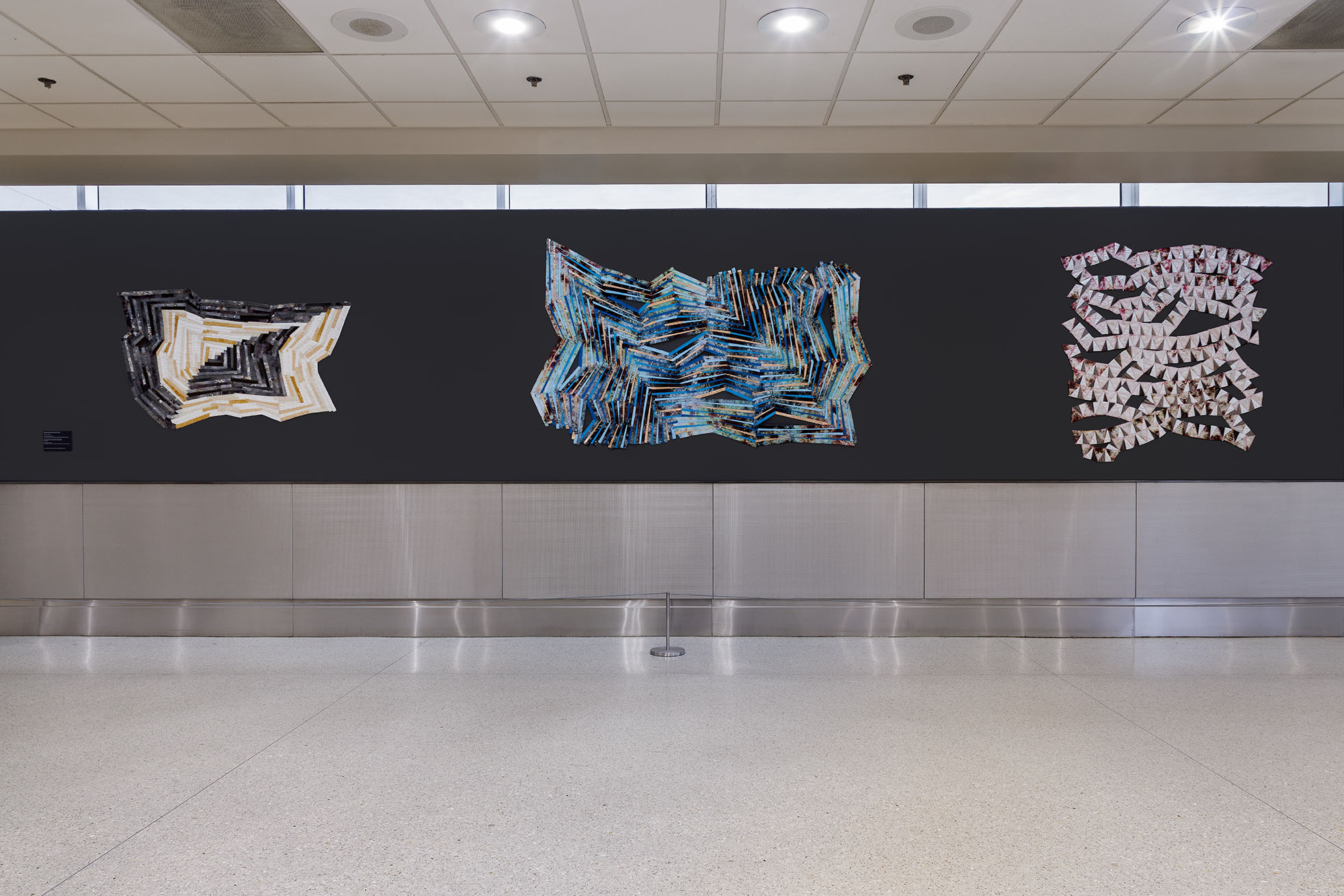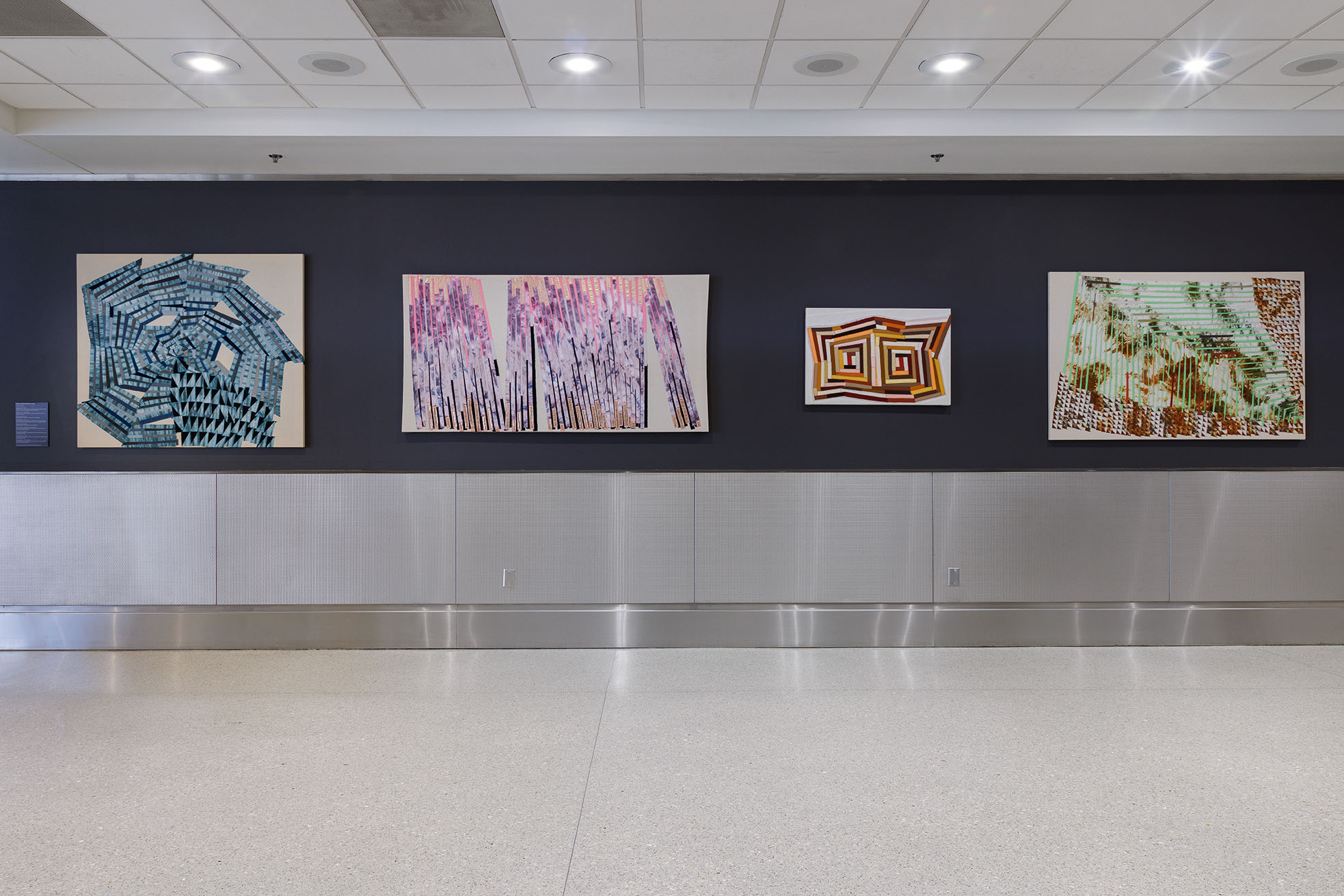 Repurposed fabrics—sourced from around Miami, including Miami International Airport’s Interior Design Department —carry personal and collective histories, which are transformed through accumulation, repetition, and painterly intuition. Whether suspended freely or taut across stretched canvas, each piece pulses with tension between structure and flow, echoing the rhythms of urban grids and natural forms.
