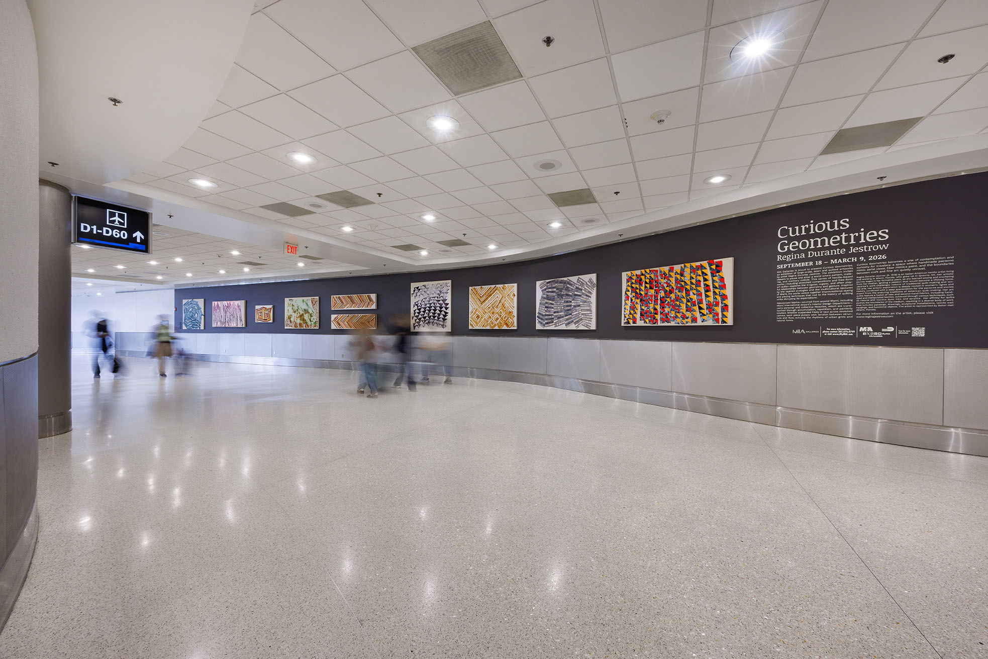 Curious Geometries becomes a site of contemplation and curiosity for travelers: a space where handmade patterns mimic aerial views, fiber mimics paint, and the boundaries between craft and fine art quietly unravel.