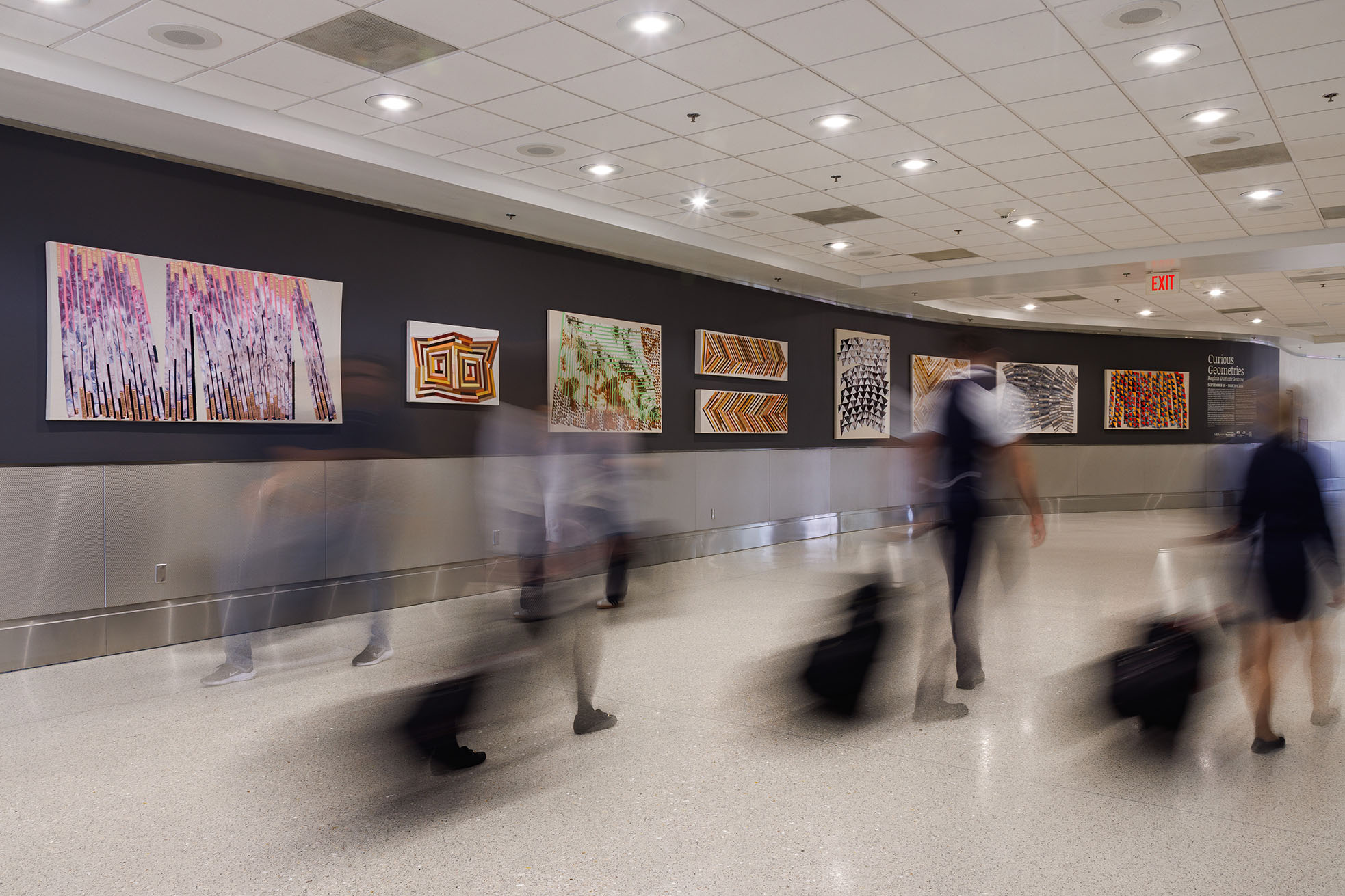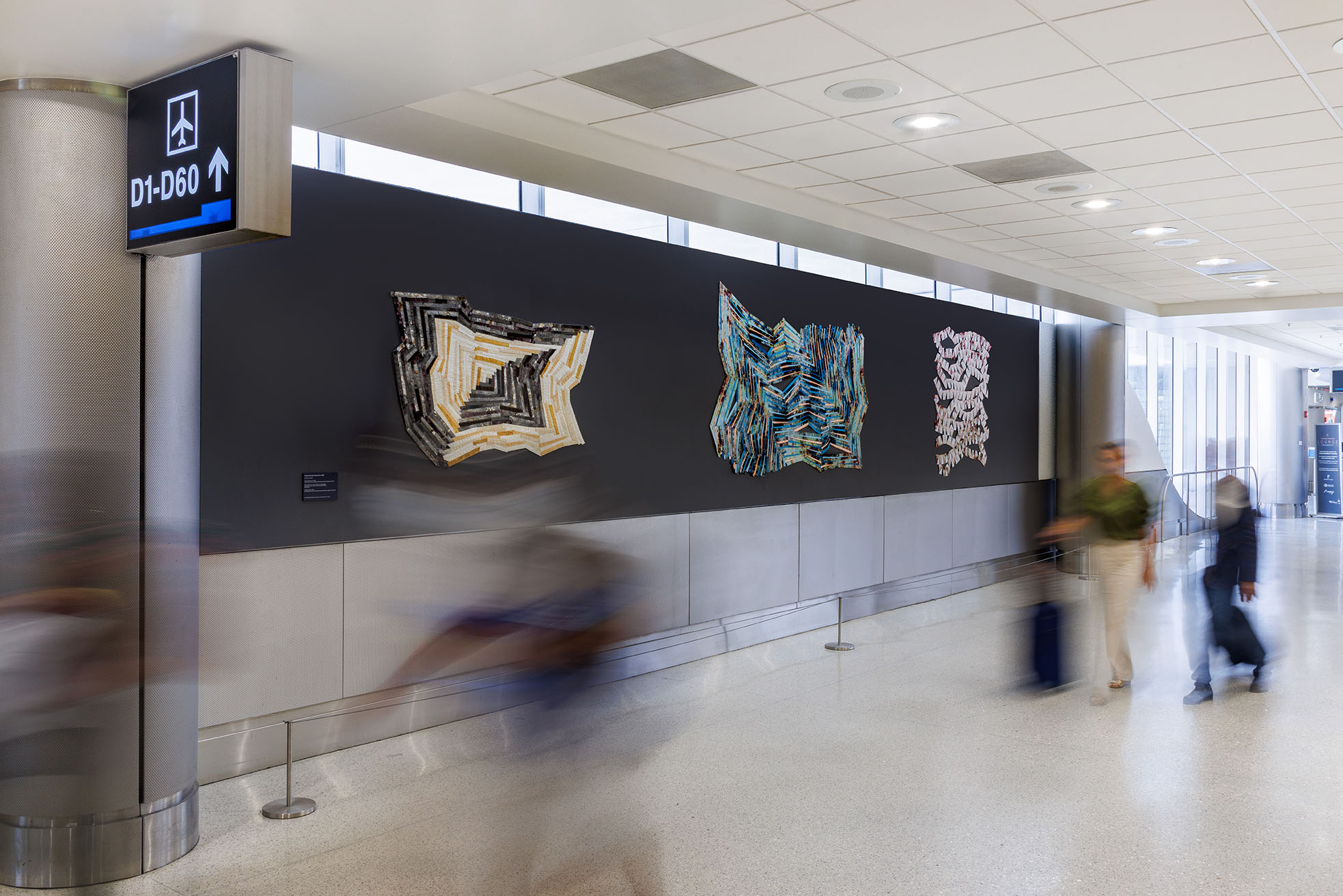 Curious Geometries becomes a site of contemplation and curiosity for travelers: a space where handmade patterns mimic aerial views, fiber mimics paint, and the boundaries between craft and fine art quietly unravel.