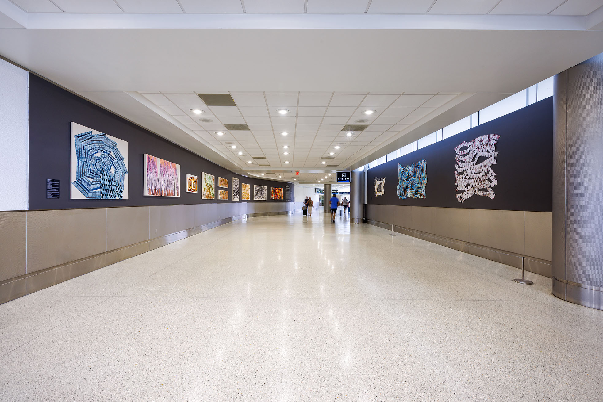 Repurposed fabrics—sourced from around Miami, including Miami International Airport’s Interior Design Department —carry personal and collective histories, which are transformed through accumulation, repetition, and painterly intuition. Whether suspended freely or taut across stretched canvas, each piece pulses with tension between structure and flow, echoing the rhythms of urban grids and natural forms.